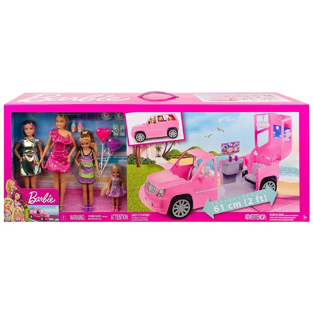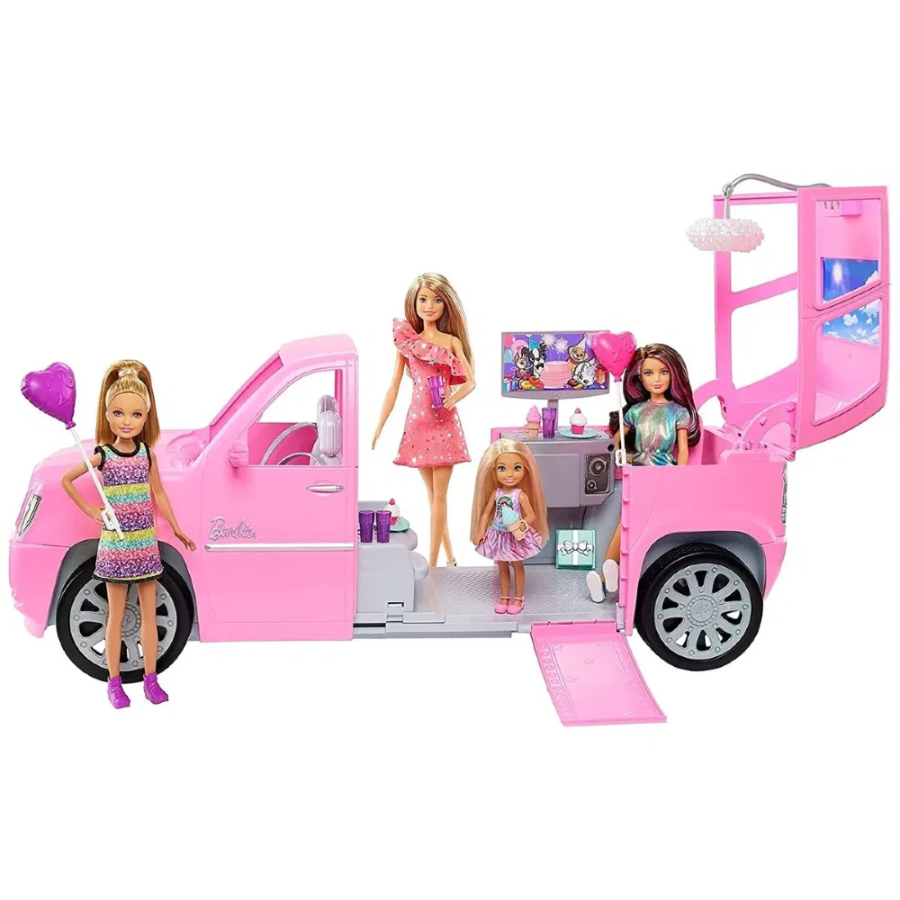 ¡La muñeca Barbie y sus 3 hermanas llegarán con estilo con esta SUV que hace que el viaje sea tan divertido como el destino! El vehículo rosa estilo SUV se expande: ¡simplemente abra la parte superior y los lados, luego tire para revelar un interior listo para la fiesta. Voltee la mesa para revelar una barra de refrigerios: ¡el diseño plug-and-play mantiene las piezas en su lugar! Deslice el televisor de la mesa: ¡tiene una escena de cumpleaños para agregar a la atmósfera de celebración!