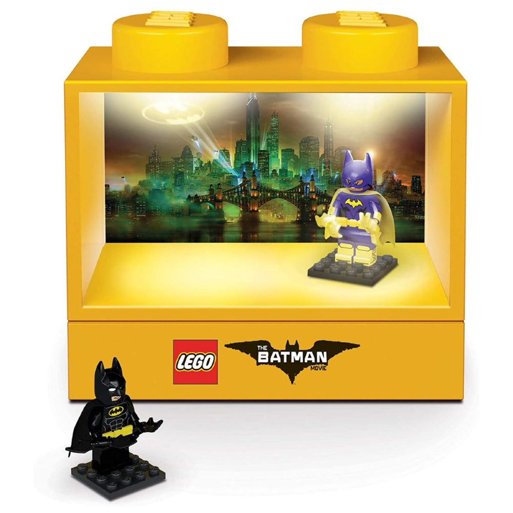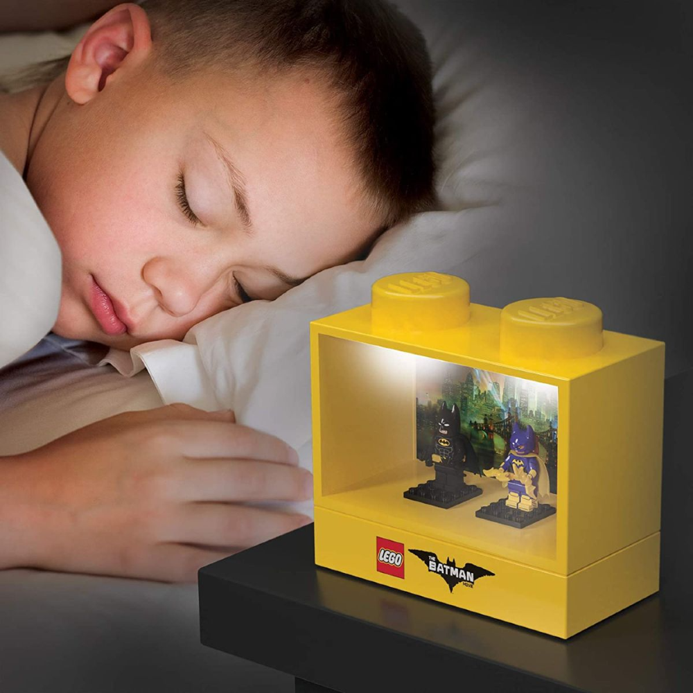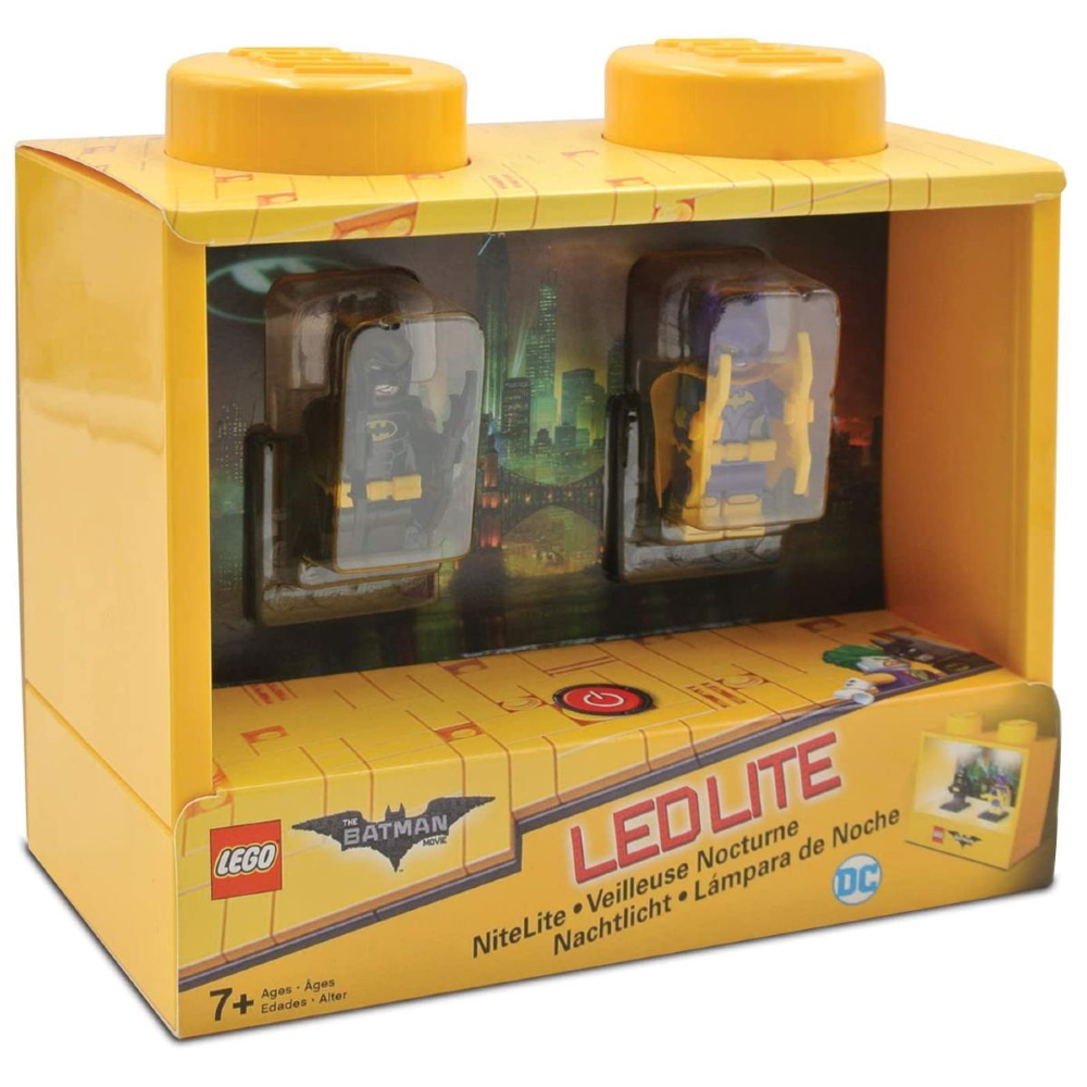 LEGO Batman Movie 1x2 NiteLite con licencia oficial con el fondo de la película LEGO Batman y dos minifiguras de la película LEGO Batman con placas de presentación. Utiliza 3 pilas AAA de 1,5 V INCLUIDAS