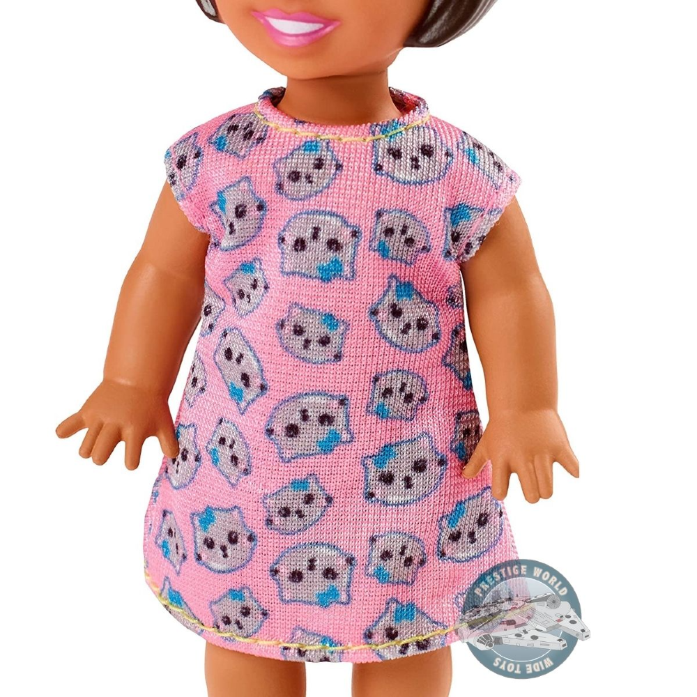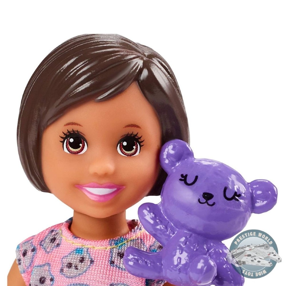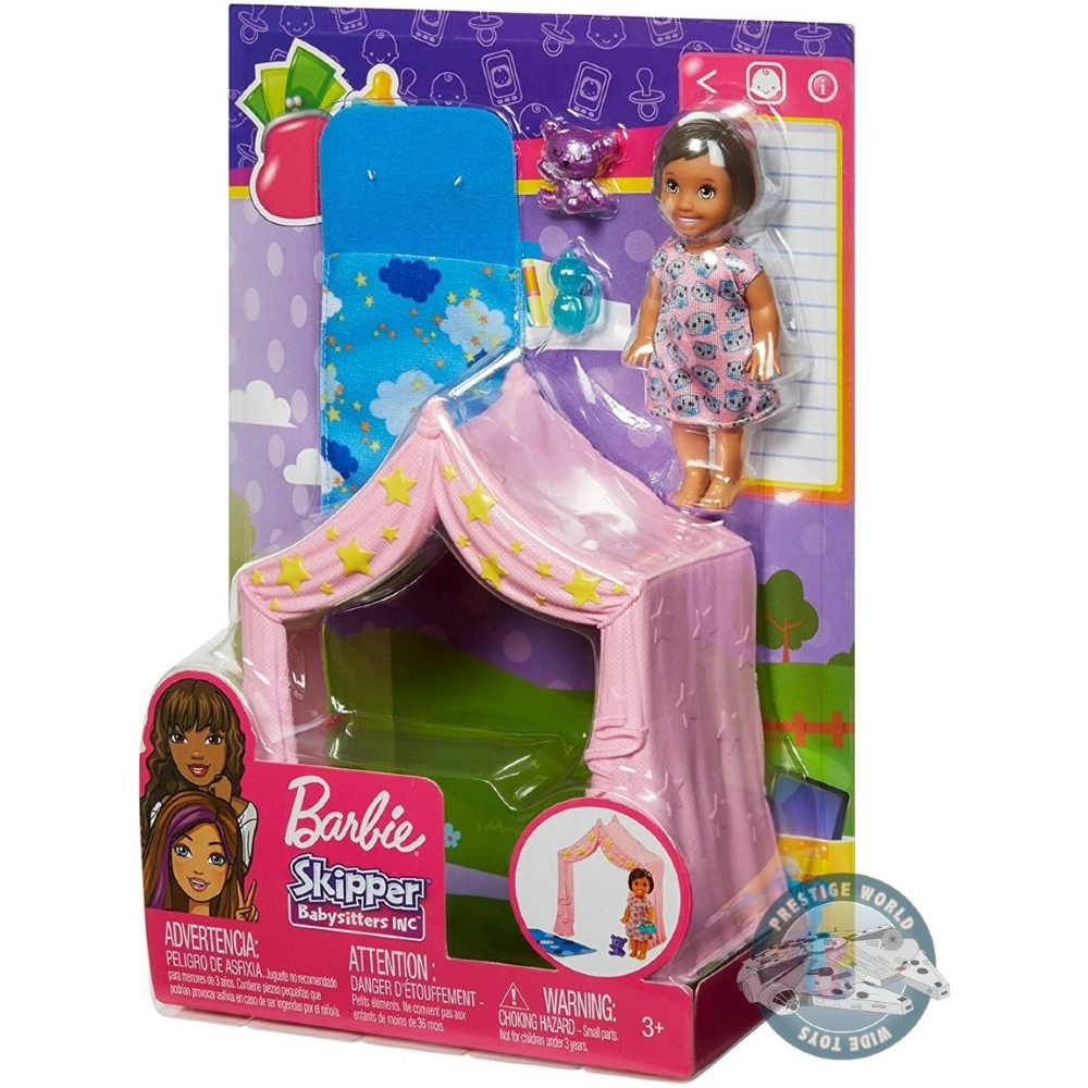 Barbie Skipper Babysitters Inc. es un hermoso playset para divertirte con una adorable muñeca y sus accesorios. La carpa rosa esta decorada con estrellas amarillas y rosadas. Mete la muñeca pequeña en su saco de dormir azul el cual tiene detalles de nubes que hace que la imaginación sueñe. Un adorable osito de peluche y una mamadera.
