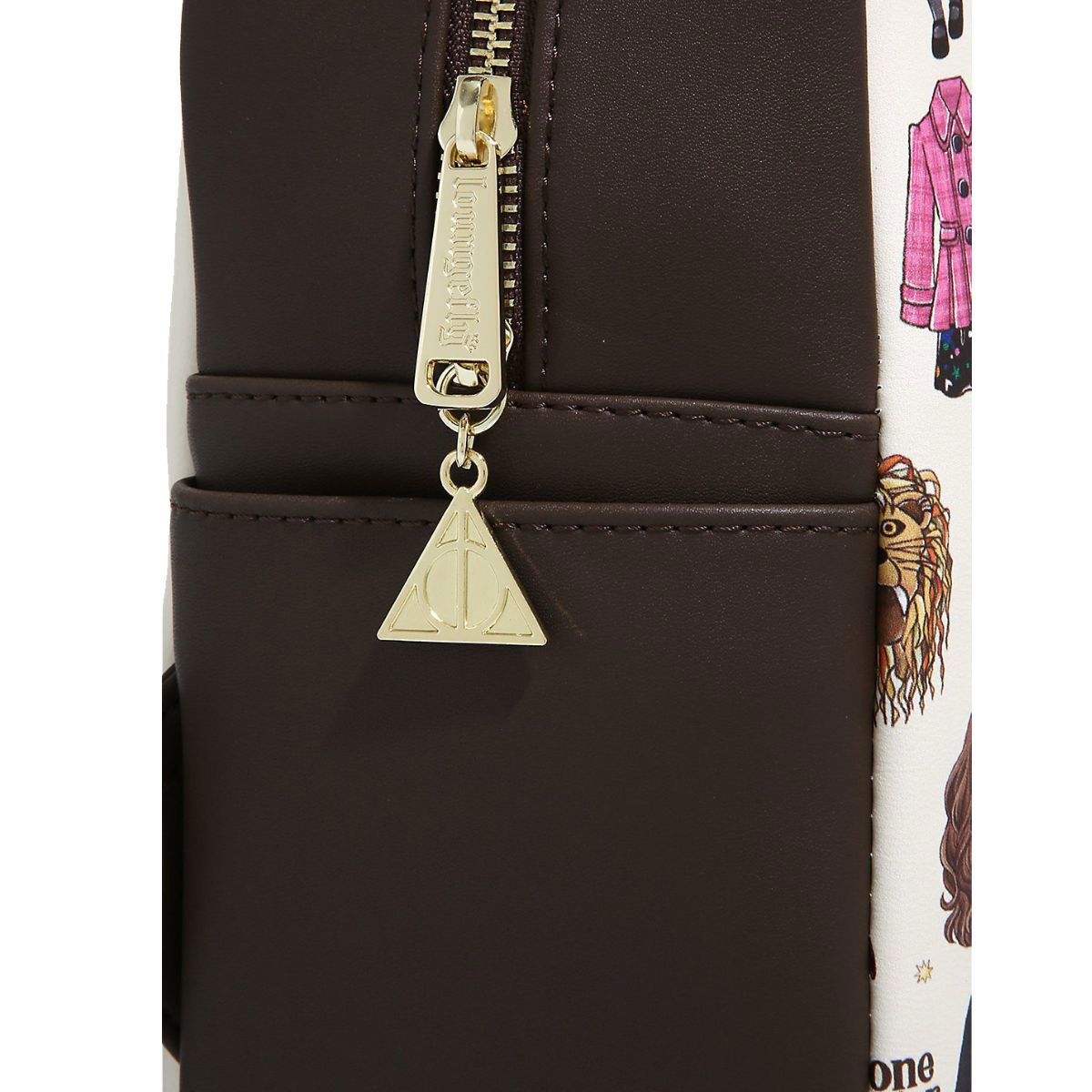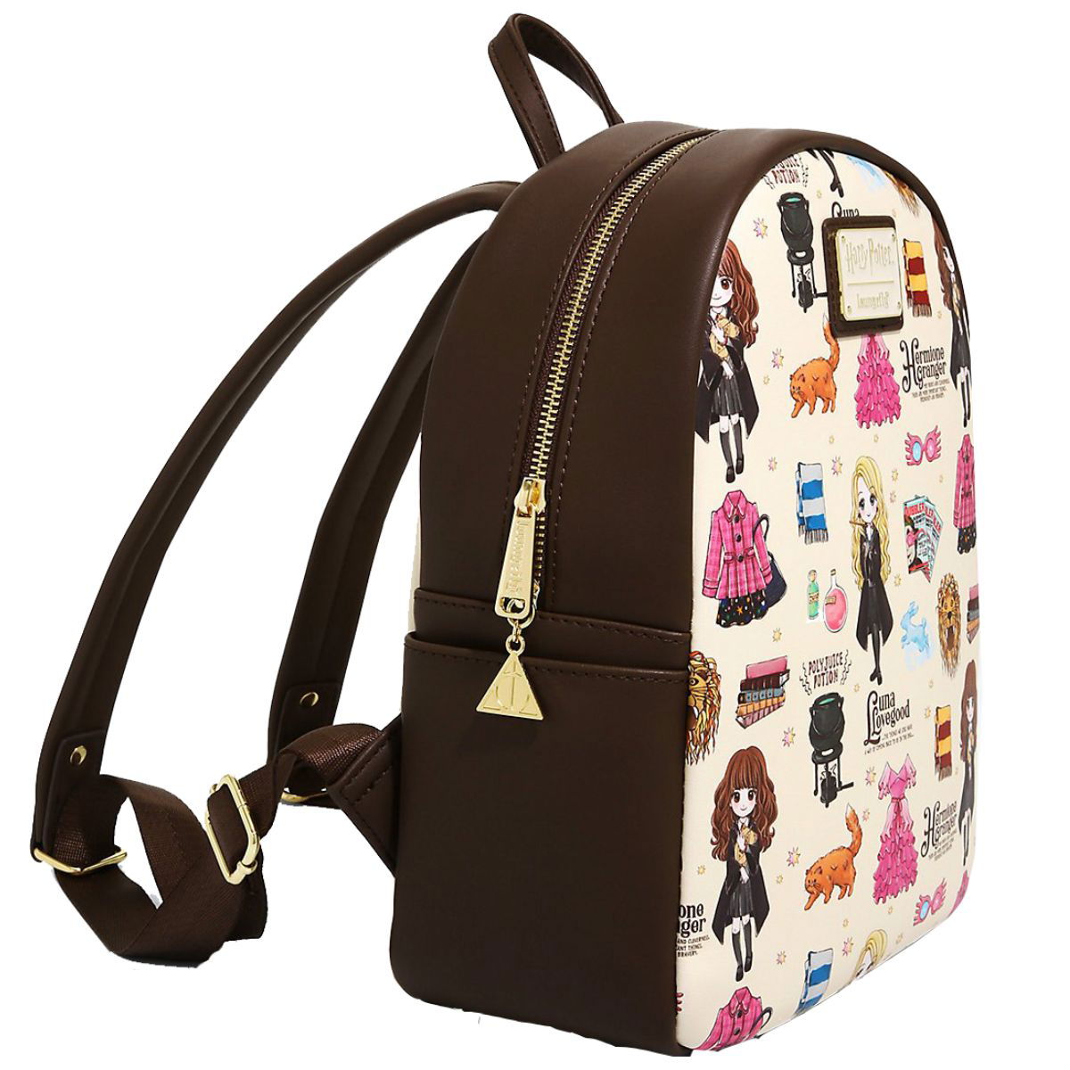 Cuando Luna Lovegood y Hermione Granger te respalden, ¡serás imparable! Las dos brujas virtuosas de Ravenclaw y Gryffindor aparecen junto a varias iconografías de Harry Potter en esta mini mochila Loungefly de cuerina sintetica.