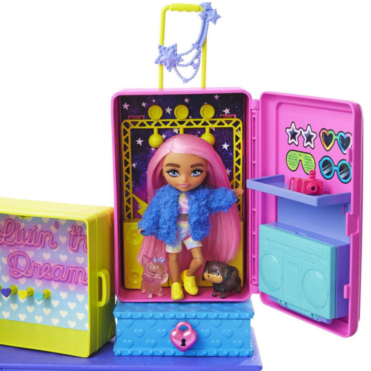Comienza la fiesta con 2 adorables cachorros de mascota y una exclusiva muñeca Barbie Extra Mini que mece el pelo largo y rosado. un atuendo teñido anudado, chaqueta peluda y accesorios