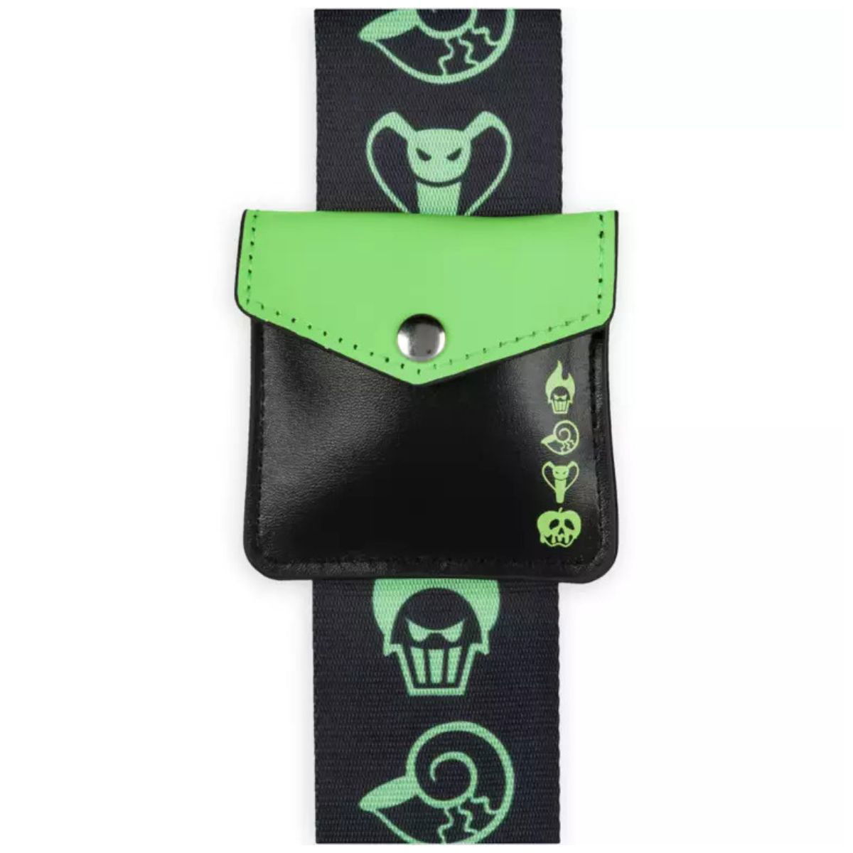 La correa presenta una ilustración del ícono de villano de Disney. El monedero que se encuentra en la correa tiene un botón a presión, de metal.