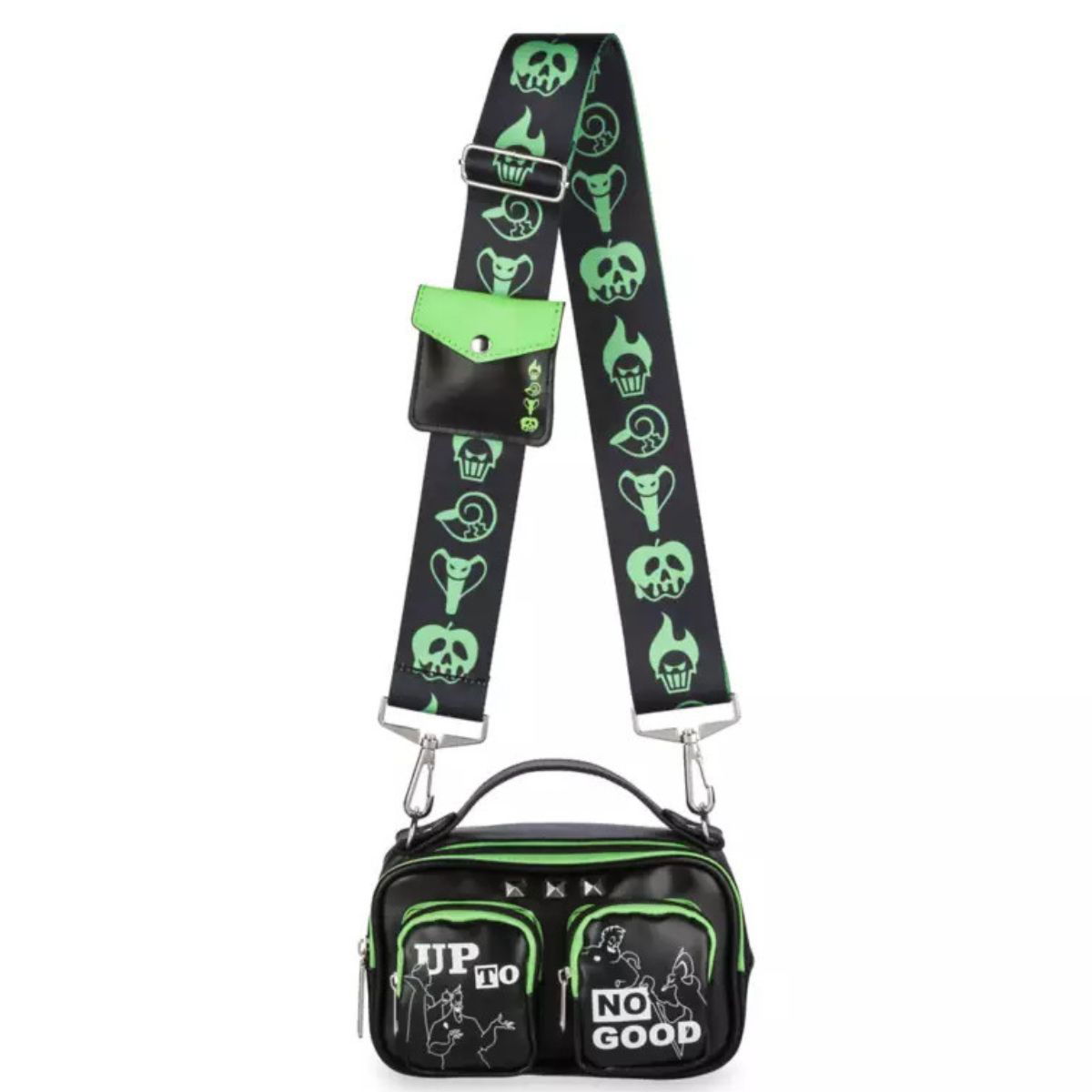 Este bolso bandolera crossbody Disney Villain hará una declaración perversa de que "no estás tramando nada bueno" cuando lo uses. Las ilustraciones de Jafar, Ursula, la Reina Malvada y Hades aparecen en los bolsillos de este elegante bolso.