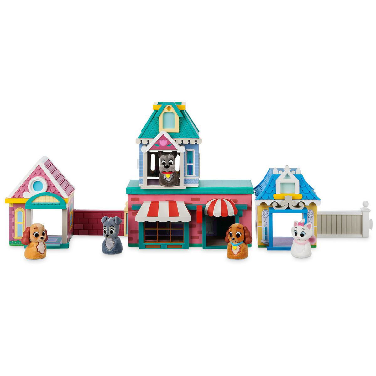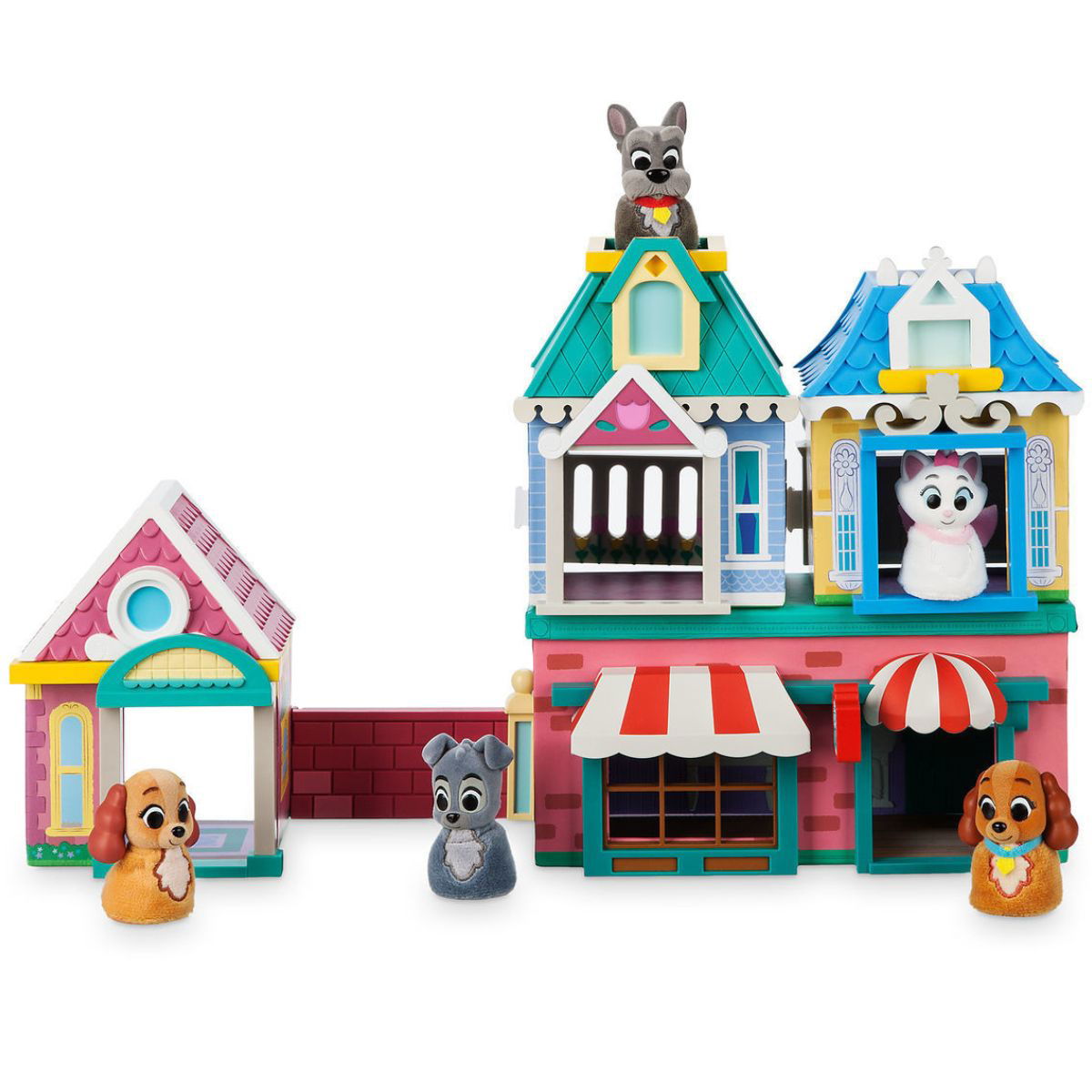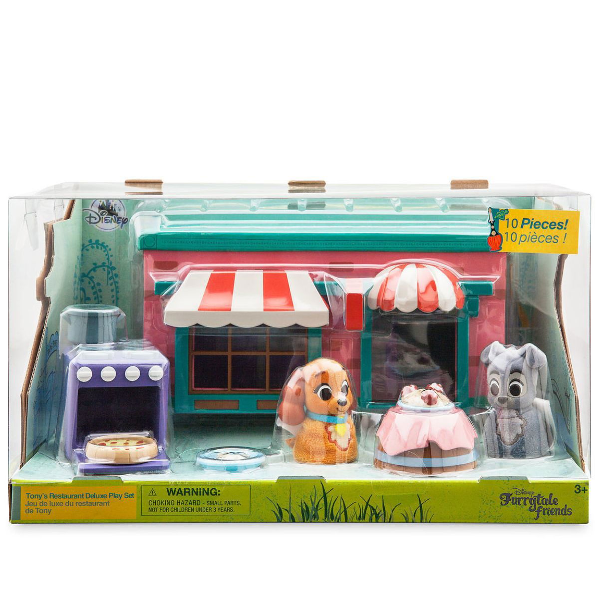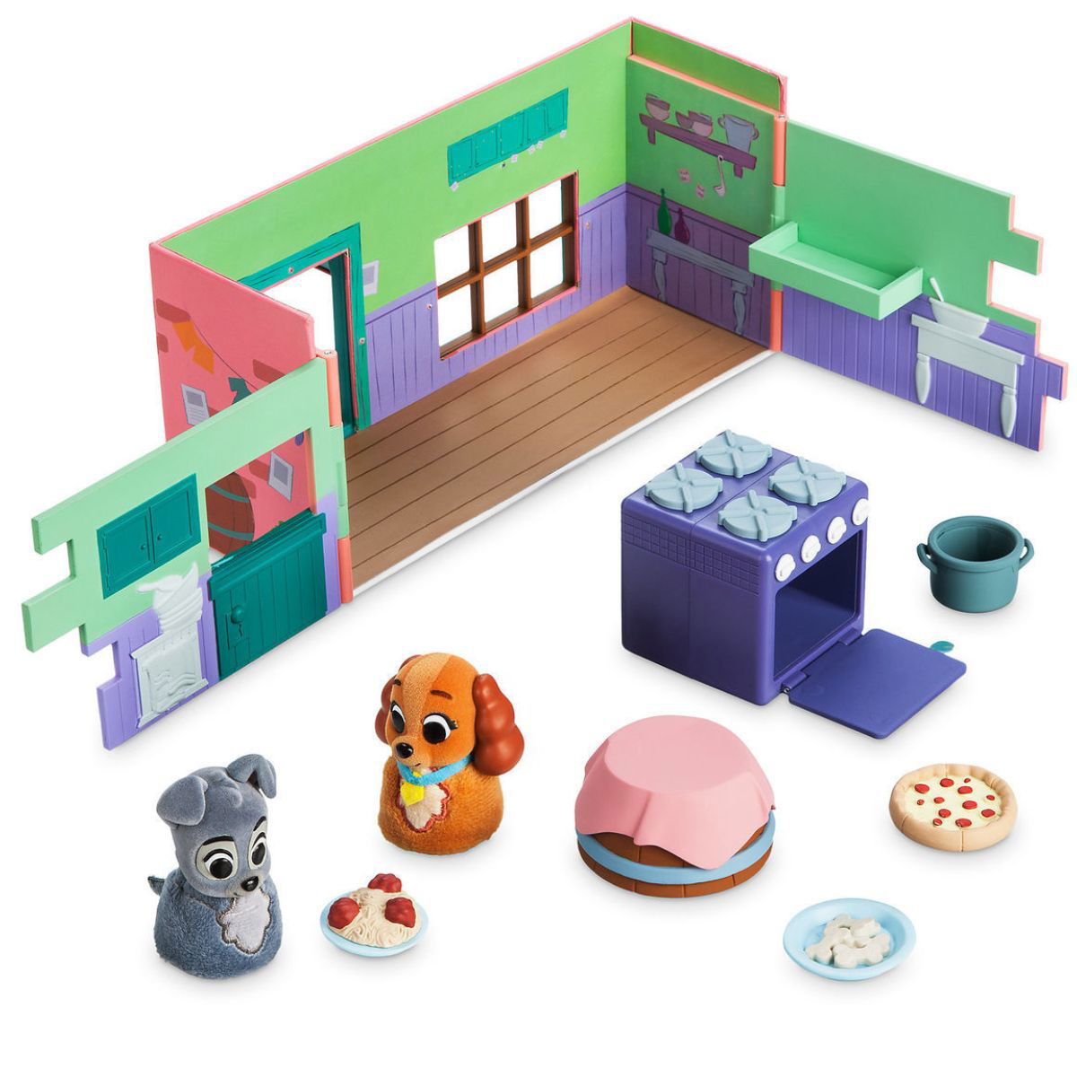 El Playset incluye: La Dama (Lady), Vagabundo (Tramp), restaurante, techo desmontable, mesa, plato de espagueti, pizza, horno, olla y plato de huesos. Dama y El vagabundo tienen cuerpos de felpa y textura de pelaje completo.