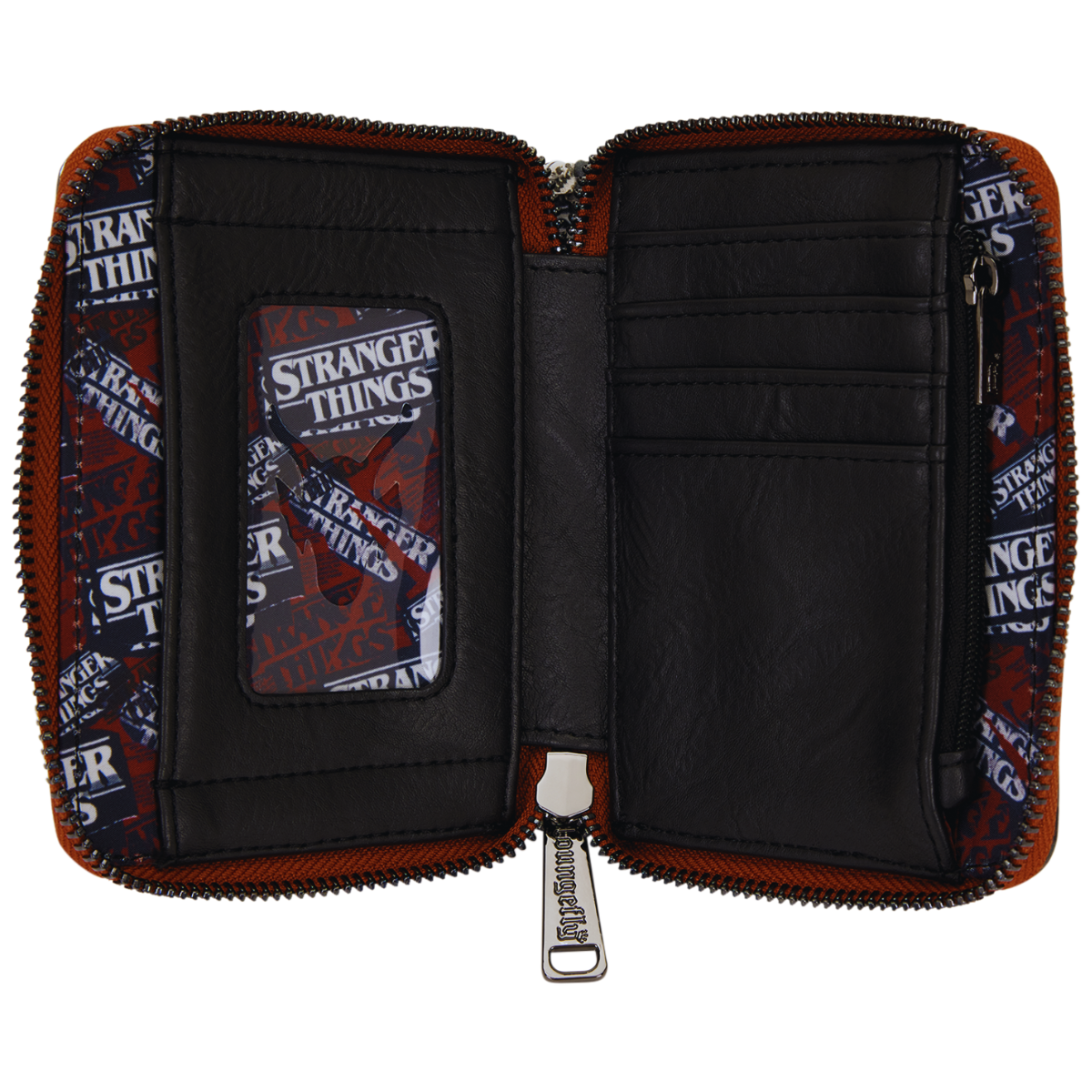 Un Demogorgon sobresale del frente. En su interior hay cuatro ranuras para tarjetas y una ranura transparente para identificación.