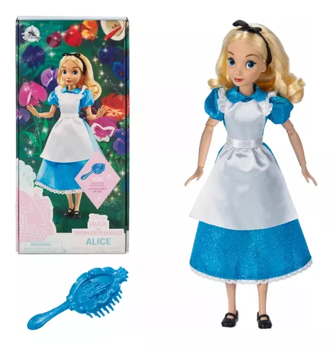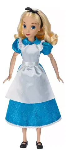 Muñeca Alicia Disney Clásica presenta un vestido de satén brillante con mangas abullonadas, delantal y cinta para el cabello.